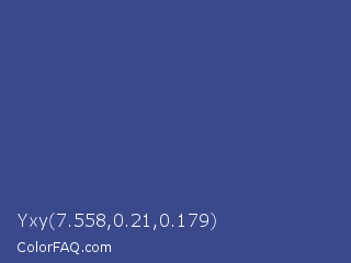 Yxy 7.558,0.21,0.179 Color is a normal blue color and the nearest color is Chambray #354e8c. Hex code #3a498c and RGB value is rgb(58,73,140). In RGB color space, this color is composed of 23% red, 29% green, 55% blue, In CMYK color space, this color is composed of 59% cyan, 48% magenta, 0% yellow , 45% black , In HSL color space, this color has a hue angle of 229° , 41% saturation and 39% lightness.