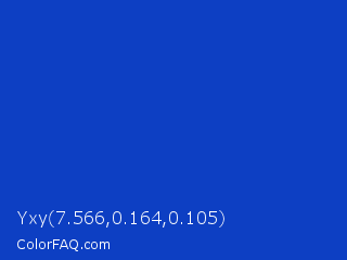Yxy 7.566,0.164,0.105 Color is a normal blue color and the nearest color is Persian Blue #1c39bb. Hex code #0d3fc3 and RGB value is rgb(13,63,195). In RGB color space, this color is composed of 5% red, 25% green, 76% blue, In CMYK color space, this color is composed of 93% cyan, 68% magenta, 0% yellow , 24% black , In HSL color space, this color has a hue angle of 224° , 88% saturation and 41% lightness.