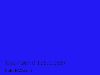 Yxy 7.567,0.156,0.068 Color is a normal indigo color and the nearest color is Bluebonnet #1c1cf0. Hex code #2219f4 and RGB value is rgb(34,25,244). In RGB color space, this color is composed of 13% red, 10% green, 96% blue, In CMYK color space, this color is composed of 86% cyan, 90% magenta, 0% yellow , 4% black , In HSL color space, this color has a hue angle of 242° , 91% saturation and 53% lightness.