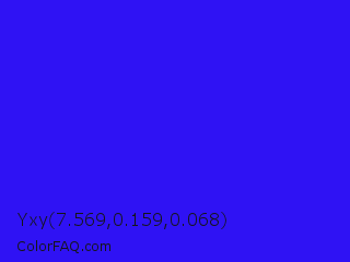 Yxy 7.569,0.159,0.068 Color is a normal indigo color and the nearest color is Bluebonnet #1c1cf0. Hex code #2f12f4 and RGB value is rgb(47,18,244). In RGB color space, this color is composed of 18% red, 7% green, 96% blue, In CMYK color space, this color is composed of 81% cyan, 93% magenta, 0% yellow , 4% black , In HSL color space, this color has a hue angle of 248° , 91% saturation and 51% lightness.