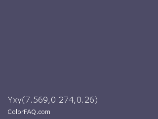 Yxy 7.569,0.274,0.26 Color is a normal indigo color and the nearest color is Mulled Wine #4e4562. Hex code #4d4b66 and RGB value is rgb(77,75,102). In RGB color space, this color is composed of 30% red, 29% green, 40% blue, In CMYK color space, this color is composed of 25% cyan, 26% magenta, 0% yellow , 60% black , In HSL color space, this color has a hue angle of 244° , 15% saturation and 35% lightness.
