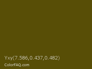 Yxy 7.586,0.437,0.482 Color is a very dark yellow color and the nearest color is Horses Neck #604913. Hex code #594e06 and RGB value is rgb(89,78,6). In RGB color space, this color is composed of 35% red, 31% green, 2% blue, In CMYK color space, this color is composed of 0% cyan, 12% magenta, 93% yellow , 65% black , In HSL color space, this color has a hue angle of 52° , 87% saturation and 19% lightness.