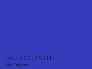 Yxy 7.5,0.179,0.111 Color is a normal blue color and the nearest color is Governor Bay #2f3cb3. Hex code #363bbb and RGB value is rgb(54,59,187). In RGB color space, this color is composed of 21% red, 23% green, 73% blue, In CMYK color space, this color is composed of 71% cyan, 68% magenta, 0% yellow , 27% black , In HSL color space, this color has a hue angle of 238° , 55% saturation and 47% lightness.