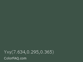 Yxy 7.634,0.295,0.365 Color is a dark green color and the nearest color is Gray Asparagus #465945. Hex code #3d5347 and RGB value is rgb(61,83,71). In RGB color space, this color is composed of 24% red, 33% green, 28% blue, In CMYK color space, this color is composed of 27% cyan, 0% magenta, 14% yellow , 67% black , In HSL color space, this color has a hue angle of 147° , 15% saturation and 28% lightness.