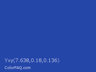 Yxy 7.638,0.18,0.136 Color is a normal blue color and the nearest color is Denim Blue #2243b6. Hex code #2546a9 and RGB value is rgb(37,70,169). In RGB color space, this color is composed of 15% red, 27% green, 66% blue, In CMYK color space, this color is composed of 78% cyan, 59% magenta, 0% yellow , 34% black , In HSL color space, this color has a hue angle of 225° , 64% saturation and 40% lightness.