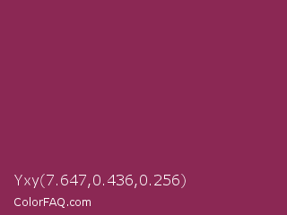 Yxy 7.647,0.436,0.256 Color is a normal rose color and the nearest color is Dark Raspberry #872657. Hex code #8b2854 and RGB value is rgb(139,40,84). In RGB color space, this color is composed of 55% red, 16% green, 33% blue, In CMYK color space, this color is composed of 0% cyan, 71% magenta, 40% yellow , 45% black , In HSL color space, this color has a hue angle of 333° , 55% saturation and 35% lightness.