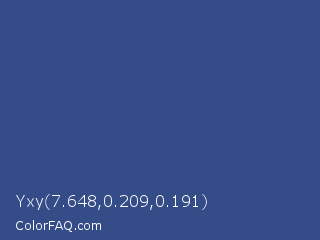 Yxy 7.648,0.209,0.191 Color is a normal blue color and the nearest color is Chambray #354e8c. Hex code #344c87 and RGB value is rgb(52,76,135). In RGB color space, this color is composed of 20% red, 30% green, 53% blue, In CMYK color space, this color is composed of 61% cyan, 44% magenta, 0% yellow , 47% black , In HSL color space, this color has a hue angle of 223° , 44% saturation and 37% lightness.