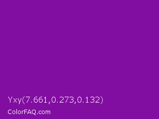Yxy 7.661,0.273,0.132 Color is a normal purple color and the nearest color is Violet RYB #8601af. Hex code #820ea1 and RGB value is rgb(130,14,161). In RGB color space, this color is composed of 51% red, 5% green, 63% blue, In CMYK color space, this color is composed of 19% cyan, 91% magenta, 0% yellow , 37% black , In HSL color space, this color has a hue angle of 287° , 84% saturation and 34% lightness.