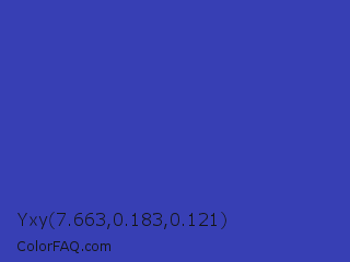 Yxy 7.663,0.183,0.121 Color is a normal blue color and the nearest color is Governor Bay #2f3cb3. Hex code #373fb4 and RGB value is rgb(55,63,180). In RGB color space, this color is composed of 22% red, 25% green, 71% blue, In CMYK color space, this color is composed of 69% cyan, 65% magenta, 0% yellow , 29% black , In HSL color space, this color has a hue angle of 236° , 53% saturation and 46% lightness.