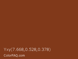 Yxy 7.668,0.528,0.378 Color is a dark orange color and the nearest color is Copper Canyon #7e3a15. Hex code #81391a and RGB value is rgb(129,57,26). In RGB color space, this color is composed of 51% red, 22% green, 10% blue, In CMYK color space, this color is composed of 0% cyan, 56% magenta, 80% yellow , 49% black , In HSL color space, this color has a hue angle of 18° , 66% saturation and 30% lightness.