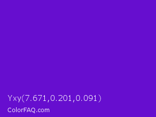 Yxy 7.671,0.201,0.091 Color is a normal violet color and the nearest color is Purple Heart Crayola #652dc1. Hex code #660ecf and RGB value is rgb(102,14,207). In RGB color space, this color is composed of 40% red, 5% green, 81% blue, In CMYK color space, this color is composed of 51% cyan, 93% magenta, 0% yellow , 19% black , In HSL color space, this color has a hue angle of 267° , 87% saturation and 43% lightness.