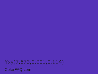 Yxy 7.673,0.201,0.114 Color is a normal indigo color and the nearest color is Ocean Blue #4f42b5. Hex code #5532b8 and RGB value is rgb(85,50,184). In RGB color space, this color is composed of 33% red, 20% green, 72% blue, In CMYK color space, this color is composed of 54% cyan, 73% magenta, 0% yellow , 28% black , In HSL color space, this color has a hue angle of 256° , 57% saturation and 46% lightness.