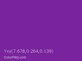 Yxy 7.678,0.264,0.139 Color is a normal purple color and the nearest color is Seance #731e8f. Hex code #79239e and RGB value is rgb(121,35,158). In RGB color space, this color is composed of 47% red, 14% green, 62% blue, In CMYK color space, this color is composed of 23% cyan, 78% magenta, 0% yellow , 38% black , In HSL color space, this color has a hue angle of 282° , 64% saturation and 38% lightness.
