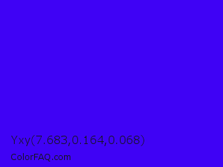 Yxy 7.683,0.164,0.068 Color is a normal indigo color and the nearest color is Electric Ultramarine #3f00ff. Hex code #3f02f5 and RGB value is rgb(63,2,245). In RGB color space, this color is composed of 25% red, 1% green, 96% blue, In CMYK color space, this color is composed of 74% cyan, 99% magenta, 0% yellow , 4% black , In HSL color space, this color has a hue angle of 255° , 98% saturation and 48% lightness.