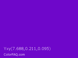 Yxy 7.688,0.211,0.095 Color is a normal purple color and the nearest color is French Violet #8806ce. Hex code #6e07ca and RGB value is rgb(110,7,202). In RGB color space, this color is composed of 43% red, 3% green, 79% blue, In CMYK color space, this color is composed of 46% cyan, 97% magenta, 0% yellow , 21% black , In HSL color space, this color has a hue angle of 272° , 93% saturation and 41% lightness.