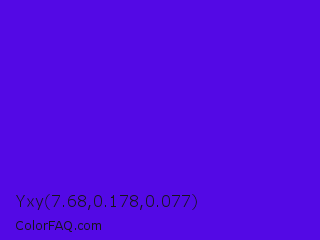 Yxy 7.68,0.178,0.077 Color is a normal indigo color and the nearest color is Han Purple #5218fa. Hex code #5309e5 and RGB value is rgb(83,9,229). In RGB color space, this color is composed of 33% red, 4% green, 90% blue, In CMYK color space, this color is composed of 64% cyan, 96% magenta, 0% yellow , 10% black , In HSL color space, this color has a hue angle of 260° , 92% saturation and 47% lightness.