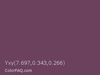 Yxy 7.697,0.343,0.266 Color is a normal magenta color and the nearest color is Cosmic #76395d. Hex code #6b415d and RGB value is rgb(107,65,93). In RGB color space, this color is composed of 42% red, 25% green, 36% blue, In CMYK color space, this color is composed of 0% cyan, 39% magenta, 13% yellow , 58% black , In HSL color space, this color has a hue angle of 320° , 24% saturation and 34% lightness.