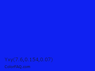 Yxy 7.6,0.154,0.07 Color is a normal blue color and the nearest color is Bluebonnet #1c1cf0. Hex code #0f21f2 and RGB value is rgb(15,33,242). In RGB color space, this color is composed of 6% red, 13% green, 95% blue, In CMYK color space, this color is composed of 94% cyan, 86% magenta, 0% yellow , 5% black , In HSL color space, this color has a hue angle of 235° , 90% saturation and 50% lightness.