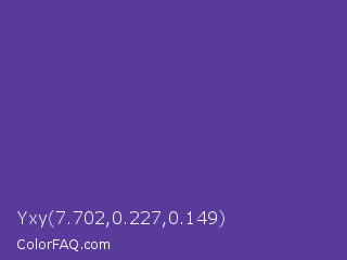 Yxy 7.702,0.227,0.149 Color is a normal indigo color and the nearest color is Gigas #523c94. Hex code #593b9c and RGB value is rgb(89,59,156). In RGB color space, this color is composed of 35% red, 23% green, 61% blue, In CMYK color space, this color is composed of 43% cyan, 62% magenta, 0% yellow , 39% black , In HSL color space, this color has a hue angle of 259° , 45% saturation and 42% lightness.