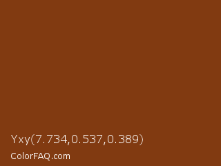 Yxy 7.734,0.537,0.389 Color is a dark orange color and the nearest color is Copper Canyon #7e3a15. Hex code #813a11 and RGB value is rgb(129,58,17). In RGB color space, this color is composed of 51% red, 23% green, 7% blue, In CMYK color space, this color is composed of 0% cyan, 55% magenta, 87% yellow , 49% black , In HSL color space, this color has a hue angle of 22° , 77% saturation and 29% lightness.