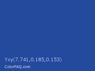 Yxy 7.741,0.185,0.153 Color is a normal blue color and the nearest color is Sapphire #2f519e. Hex code #244a9e and RGB value is rgb(36,74,158). In RGB color space, this color is composed of 14% red, 29% green, 62% blue, In CMYK color space, this color is composed of 77% cyan, 53% magenta, 0% yellow , 38% black , In HSL color space, this color has a hue angle of 221° , 63% saturation and 38% lightness.