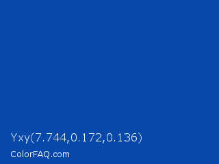 Yxy 7.744,0.172,0.136 Color is a normal blue color and the nearest color is Cobalt #0047ab. Hex code #0649ab and RGB value is rgb(6,73,171). In RGB color space, this color is composed of 2% red, 29% green, 67% blue, In CMYK color space, this color is composed of 96% cyan, 57% magenta, 0% yellow , 33% black , In HSL color space, this color has a hue angle of 216° , 93% saturation and 35% lightness.
