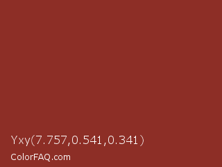Yxy 7.757,0.541,0.341 Color is a normal red color and the nearest color is Burnt Umber #8a3324. Hex code #8d2e26 and RGB value is rgb(141,46,38). In RGB color space, this color is composed of 55% red, 18% green, 15% blue, In CMYK color space, this color is composed of 0% cyan, 67% magenta, 73% yellow , 45% black , In HSL color space, this color has a hue angle of 5° , 58% saturation and 35% lightness.