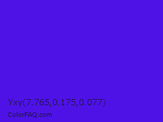 Yxy 7.765,0.175,0.077 Color is a normal indigo color and the nearest color is Han Purple #5218fa. Hex code #4e12e6 and RGB value is rgb(78,18,230). In RGB color space, this color is composed of 31% red, 7% green, 90% blue, In CMYK color space, this color is composed of 66% cyan, 92% magenta, 0% yellow , 10% black , In HSL color space, this color has a hue angle of 257° , 85% saturation and 49% lightness.