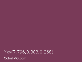 Yxy 7.796,0.383,0.268 Color is a normal rose color and the nearest color is Cosmic #76395d. Hex code #793a58 and RGB value is rgb(121,58,88). In RGB color space, this color is composed of 47% red, 23% green, 35% blue, In CMYK color space, this color is composed of 0% cyan, 52% magenta, 27% yellow , 53% black , In HSL color space, this color has a hue angle of 331° , 35% saturation and 35% lightness.