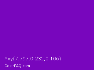 Yxy 7.797,0.231,0.106 Color is a normal purple color and the nearest color is Violet RYB #8601af. Hex code #7806bd and RGB value is rgb(120,6,189). In RGB color space, this color is composed of 47% red, 2% green, 74% blue, In CMYK color space, this color is composed of 37% cyan, 97% magenta, 0% yellow , 26% black , In HSL color space, this color has a hue angle of 277° , 94% saturation and 38% lightness.