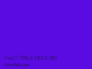 Yxy 7.799,0.183,0.08 Color is a normal violet color and the nearest color is Han Purple #5218fa. Hex code #590be1 and RGB value is rgb(89,11,225). In RGB color space, this color is composed of 35% red, 4% green, 88% blue, In CMYK color space, this color is composed of 60% cyan, 95% magenta, 0% yellow , 12% black , In HSL color space, this color has a hue angle of 262° , 91% saturation and 46% lightness.