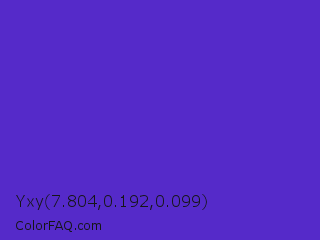Yxy 7.804,0.192,0.099 Color is a normal indigo color and the nearest color is Purple Heart Crayola #652dc1. Hex code #552ac9 and RGB value is rgb(85,42,201). In RGB color space, this color is composed of 33% red, 16% green, 79% blue, In CMYK color space, this color is composed of 58% cyan, 79% magenta, 0% yellow , 21% black , In HSL color space, this color has a hue angle of 256° , 65% saturation and 48% lightness.