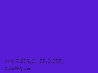Yxy 7.809,0.188,0.088 Color is a normal indigo color and the nearest color is Purple Heart Crayola #652dc1. Hex code #591cd6 and RGB value is rgb(89,28,214). In RGB color space, this color is composed of 35% red, 11% green, 84% blue, In CMYK color space, this color is composed of 58% cyan, 87% magenta, 0% yellow , 16% black , In HSL color space, this color has a hue angle of 260° , 77% saturation and 47% lightness.