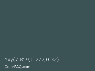 Yxy 7.819,0.272,0.32 Color is a dark cyan color and the nearest color is River Bed #434c59. Hex code #3c5356 and RGB value is rgb(60,83,86). In RGB color space, this color is composed of 24% red, 33% green, 34% blue, In CMYK color space, this color is composed of 30% cyan, 3% magenta, 0% yellow , 66% black , In HSL color space, this color has a hue angle of 187° , 18% saturation and 29% lightness.