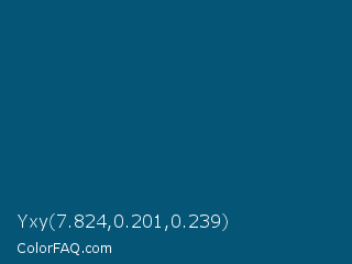 Yxy 7.824,0.201,0.239 Color is a dark blue color and the nearest color is Orient #015e85. Hex code #055576 and RGB value is rgb(5,85,118). In RGB color space, this color is composed of 2% red, 33% green, 46% blue, In CMYK color space, this color is composed of 96% cyan, 28% magenta, 0% yellow , 54% black , In HSL color space, this color has a hue angle of 198° , 92% saturation and 24% lightness.