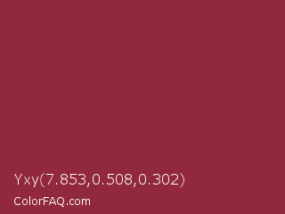 Yxy 7.853,0.508,0.302 Color is a normal red color and the nearest color is Big Dip O Ruby #9c2542. Hex code #91283b and RGB value is rgb(145,40,59). In RGB color space, this color is composed of 57% red, 16% green, 23% blue, In CMYK color space, this color is composed of 0% cyan, 72% magenta, 59% yellow , 43% black , In HSL color space, this color has a hue angle of 349° , 57% saturation and 36% lightness.