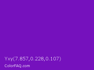 Yxy 7.857,0.228,0.107 Color is a normal purple color and the nearest color is Violet RYB #8601af. Hex code #7511bd and RGB value is rgb(117,17,189). In RGB color space, this color is composed of 46% red, 7% green, 74% blue, In CMYK color space, this color is composed of 38% cyan, 91% magenta, 0% yellow , 26% black , In HSL color space, this color has a hue angle of 275° , 83% saturation and 40% lightness.