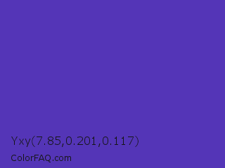 Yxy 7.85,0.201,0.117 Color is a normal indigo color and the nearest color is Ocean Blue #4f42b5. Hex code #5435b7 and RGB value is rgb(84,53,183). In RGB color space, this color is composed of 33% red, 21% green, 72% blue, In CMYK color space, this color is composed of 54% cyan, 71% magenta, 0% yellow , 28% black , In HSL color space, this color has a hue angle of 254° , 55% saturation and 46% lightness.