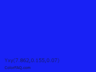 Yxy 7.862,0.155,0.07 Color is a normal blue color and the nearest color is Bluebonnet #1c1cf0. Hex code #1821f5 and RGB value is rgb(24,33,245). In RGB color space, this color is composed of 9% red, 13% green, 96% blue, In CMYK color space, this color is composed of 90% cyan, 87% magenta, 0% yellow , 4% black , In HSL color space, this color has a hue angle of 238° , 92% saturation and 53% lightness.