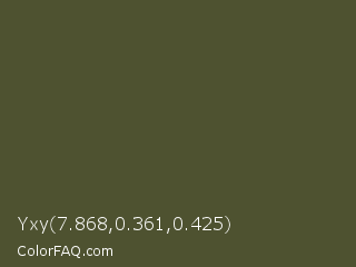 Yxy 7.868,0.361,0.425 Color is a dark yellow color and the nearest color is Woodland #4d5328. Hex code #4e5230 and RGB value is rgb(78,82,48). In RGB color space, this color is composed of 31% red, 32% green, 19% blue, In CMYK color space, this color is composed of 5% cyan, 0% magenta, 41% yellow , 68% black , In HSL color space, this color has a hue angle of 67° , 26% saturation and 25% lightness.