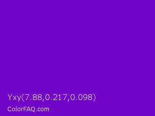 Yxy 7.88,0.217,0.098 Color is a normal purple color and the nearest color is French Violet #8806ce. Hex code #7205c8 and RGB value is rgb(114,5,200). In RGB color space, this color is composed of 45% red, 2% green, 78% blue, In CMYK color space, this color is composed of 43% cyan, 98% magenta, 0% yellow , 22% black , In HSL color space, this color has a hue angle of 274° , 95% saturation and 40% lightness.