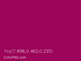 Yxy 7.898,0.463,0.235 Color is a normal magenta color and the nearest color is Jazzberry Jam #a50b5e. Hex code #9c0559 and RGB value is rgb(156,5,89). In RGB color space, this color is composed of 61% red, 2% green, 35% blue, In CMYK color space, this color is composed of 0% cyan, 97% magenta, 43% yellow , 39% black , In HSL color space, this color has a hue angle of 327° , 94% saturation and 32% lightness.