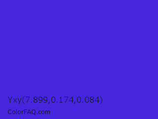 Yxy 7.899,0.174,0.084 Color is a normal indigo color and the nearest color is Han Purple #5218fa. Hex code #4625de and RGB value is rgb(70,37,222). In RGB color space, this color is composed of 27% red, 15% green, 87% blue, In CMYK color space, this color is composed of 68% cyan, 83% magenta, 0% yellow , 13% black , In HSL color space, this color has a hue angle of 251° , 74% saturation and 51% lightness.