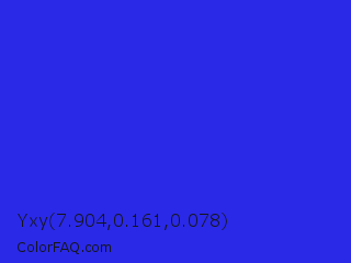 Yxy 7.904,0.161,0.078 Color is a normal blue color and the nearest color is Palatinate Blue #273be2. Hex code #2a29e8 and RGB value is rgb(42,41,232). In RGB color space, this color is composed of 16% red, 16% green, 91% blue, In CMYK color space, this color is composed of 82% cyan, 82% magenta, 0% yellow , 9% black , In HSL color space, this color has a hue angle of 240° , 81% saturation and 54% lightness.