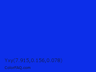 Yxy 7.915,0.156,0.078 Color is a normal blue color and the nearest color is Bluebonnet #1c1cf0. Hex code #0c2ee9 and RGB value is rgb(12,46,233). In RGB color space, this color is composed of 5% red, 18% green, 91% blue, In CMYK color space, this color is composed of 95% cyan, 80% magenta, 0% yellow , 9% black , In HSL color space, this color has a hue angle of 231° , 90% saturation and 48% lightness.