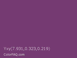 Yxy 7.931,0.323,0.219 Color is a normal magenta color and the nearest color is Maximum Purple #733380. Hex code #743a71 and RGB value is rgb(116,58,113). In RGB color space, this color is composed of 45% red, 23% green, 44% blue, In CMYK color space, this color is composed of 0% cyan, 50% magenta, 3% yellow , 55% black , In HSL color space, this color has a hue angle of 303° , 33% saturation and 34% lightness.
