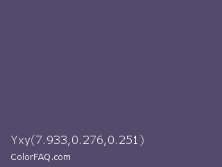 Yxy 7.933,0.276,0.251 Color is a normal indigo color and the nearest color is Independence #4c516d. Hex code #534b6b and RGB value is rgb(83,75,107). In RGB color space, this color is composed of 33% red, 29% green, 42% blue, In CMYK color space, this color is composed of 22% cyan, 30% magenta, 0% yellow , 58% black , In HSL color space, this color has a hue angle of 255° , 18% saturation and 36% lightness.