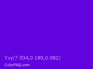 Yxy 7.934,0.189,0.082 Color is a normal violet color and the nearest color is Electric Indigo #6f00ff. Hex code #6103df and RGB value is rgb(97,3,223). In RGB color space, this color is composed of 38% red, 1% green, 87% blue, In CMYK color space, this color is composed of 57% cyan, 99% magenta, 0% yellow , 13% black , In HSL color space, this color has a hue angle of 266° , 97% saturation and 44% lightness.