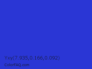Yxy 7.935,0.166,0.092 Color is a normal blue color and the nearest color is Palatinate Blue #273be2. Hex code #2a36d5 and RGB value is rgb(42,54,213). In RGB color space, this color is composed of 16% red, 21% green, 84% blue, In CMYK color space, this color is composed of 80% cyan, 75% magenta, 0% yellow , 16% black , In HSL color space, this color has a hue angle of 236° , 67% saturation and 50% lightness.