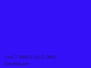 Yxy 7.948,0.16,0.068 Color is a normal indigo color and the nearest color is Electric Ultramarine #3f00ff. Hex code #3410f9 and RGB value is rgb(52,16,249). In RGB color space, this color is composed of 20% red, 6% green, 98% blue, In CMYK color space, this color is composed of 79% cyan, 94% magenta, 0% yellow , 2% black , In HSL color space, this color has a hue angle of 249° , 95% saturation and 52% lightness.